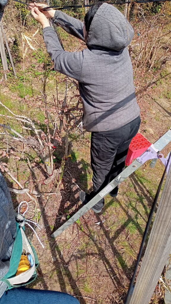 二人で網を 2025 12/16 DIY・園の整備 2022年3月22日2025年12月16日 ブルーベリーの郷です。この日は、真理子と二人で防鳥ネットを張りました。 支柱に、ガイドのタフロンテープを張り、その上にネットを渡します。二人揃って脚立の作業です。 私が少し高い脚立に乗り網を持ち上げ、少し低い脚立で真理子が網を留める。 モグラの穴に脚立の足が埋まったり、風に煽られたり。大変大変! 協力して作業中です。 DIY・園の整備